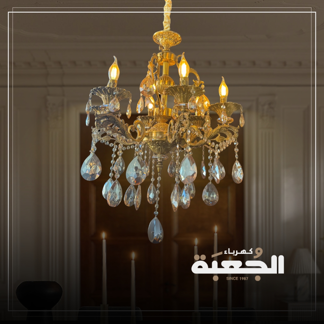مواصفات الصنف : ثريا تمزج الطابع الكريستالي والكلاسيكي تحتوي على 8 أذرع كلاسيكية مع حبات كريستال مرصعة