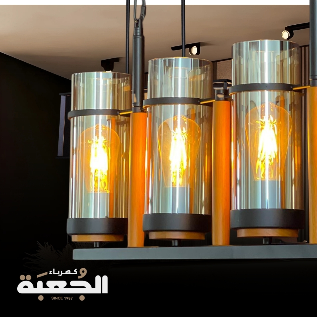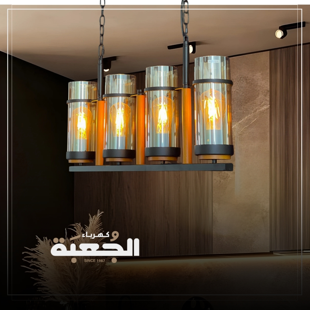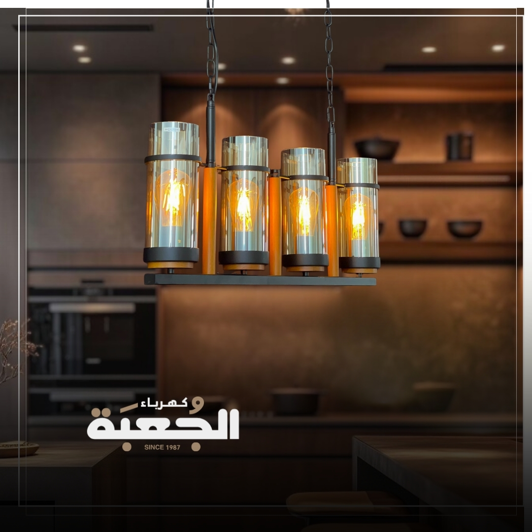 مواصفات الصنف: معلقة رباعية بتصميم معدني وزجاجي عسلي ممزوج بالخشب بطابع حديث تستخدم لعدة أماكن مثل المطبخ