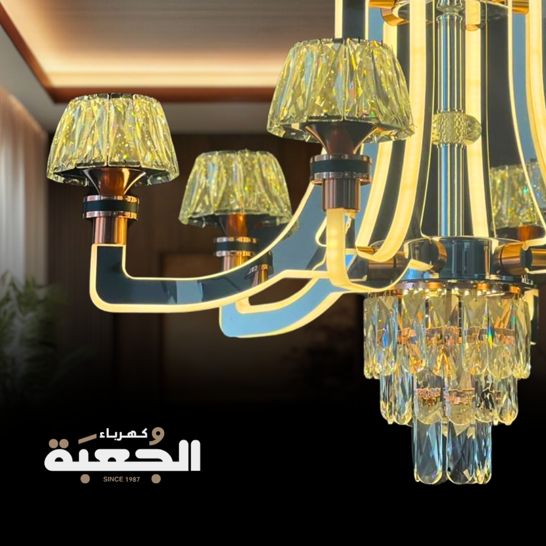 مواصفات الصنف : ثريا فخمة تجمع بين الطابع الكريستالي والحديث تتكون من 6 أذرع بلون (Rose Gold) تحتوي على حبات كريستالية مرصعة وكاسات كريستال مع اكريليك ابيض