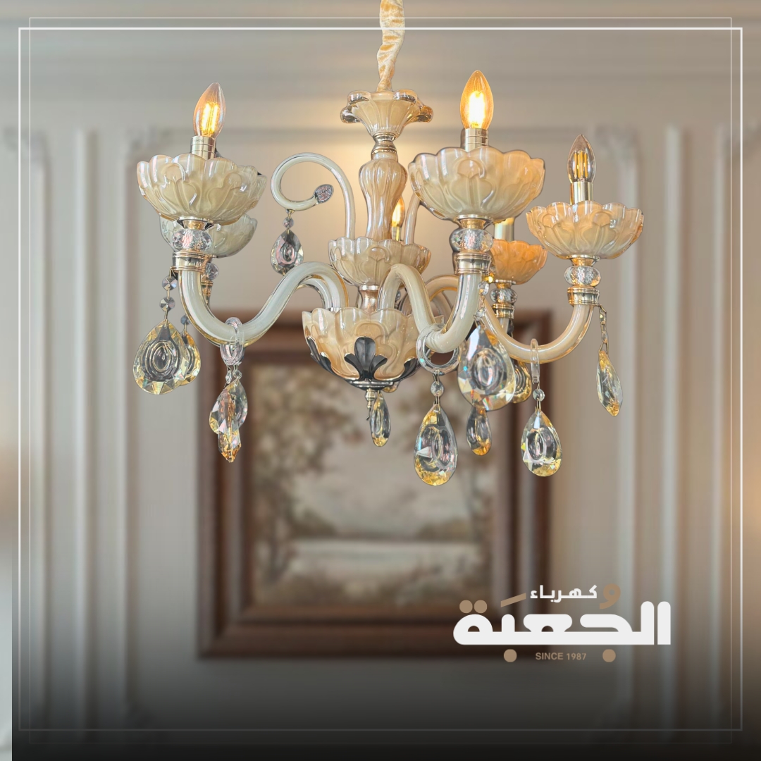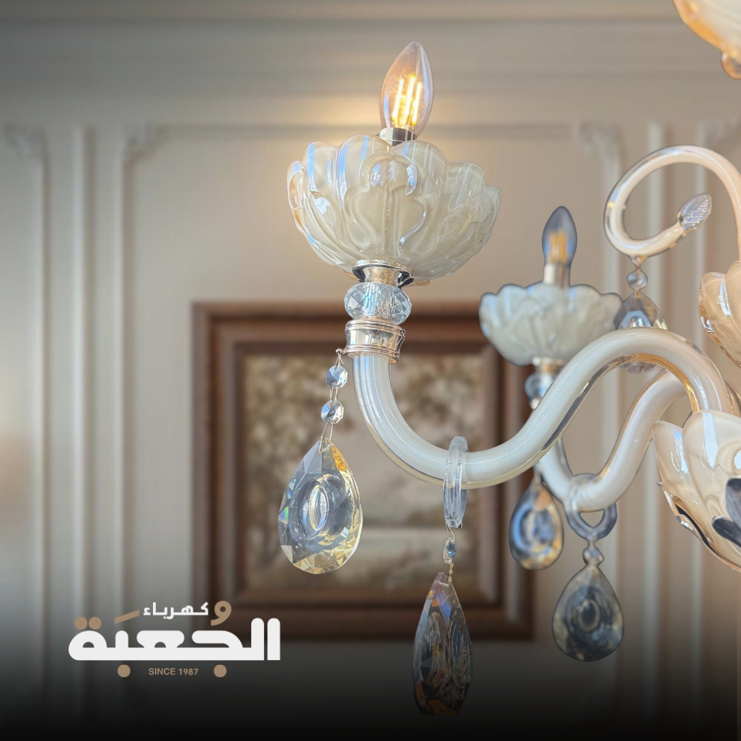مواصفات الصنف : ثريا كريستالية زجاجية باللون الابيض والعسلي لها طابع كلاسيكي فخم تضفي الفخامة والاناقة للمكان