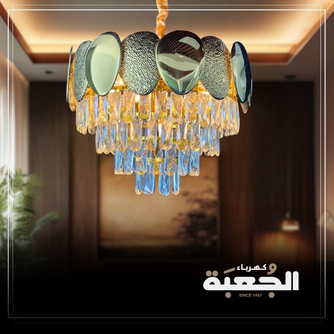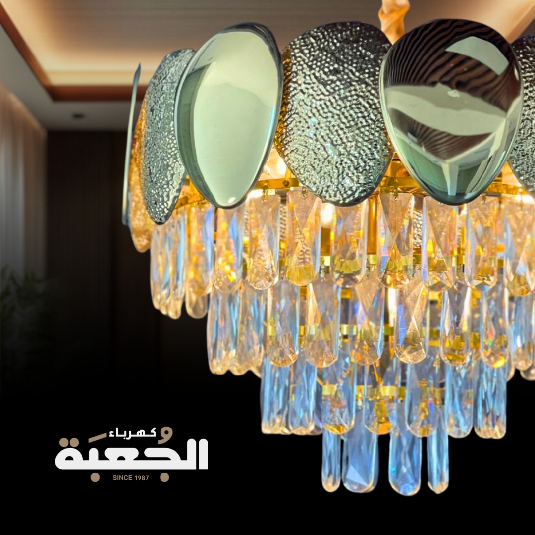 مواصفات الصنف: ثريا من طبقات كريستالية ممزوجة بتصميم من الاكسسوار الذهبي لها استخدامات عديدة مثل الصالون او غرفة المعيشة