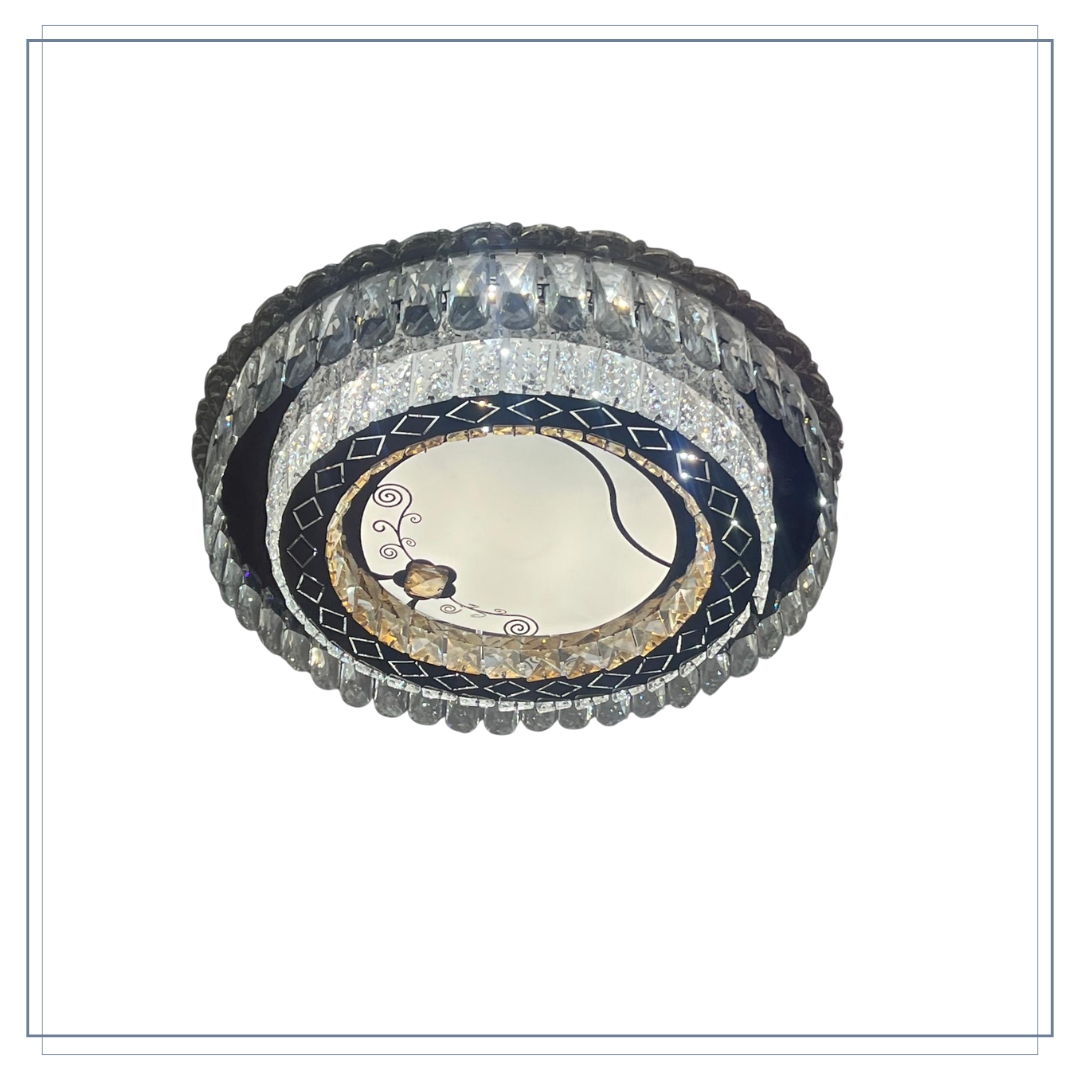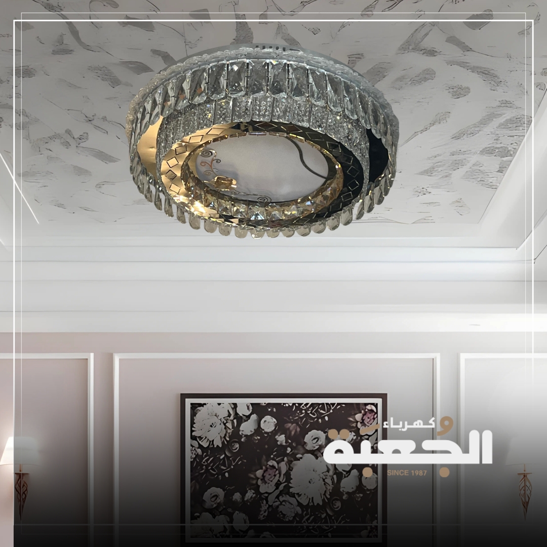 مواصفات الصنف : ثريا كريستال ثابتة بالسقف مع قاعدة دائرية الشكل تستخدم في عدة أماكن مثل الصالون