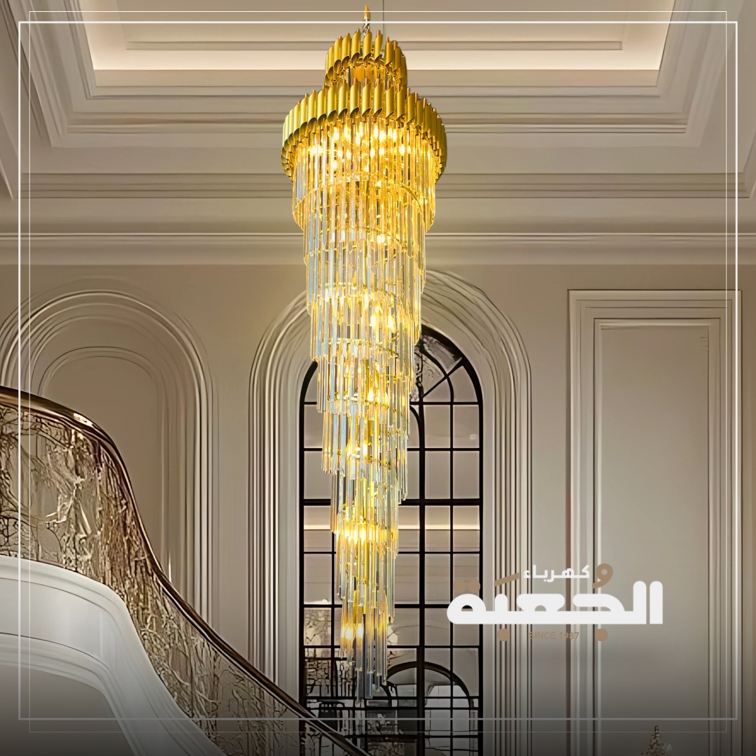 مواصفات الصنف: ثريا درج كريستالية باللون الذهبي بشكل لولبي ، تضفي الفخامة للمكان وتعطي لمسة ساحرة للدرج
