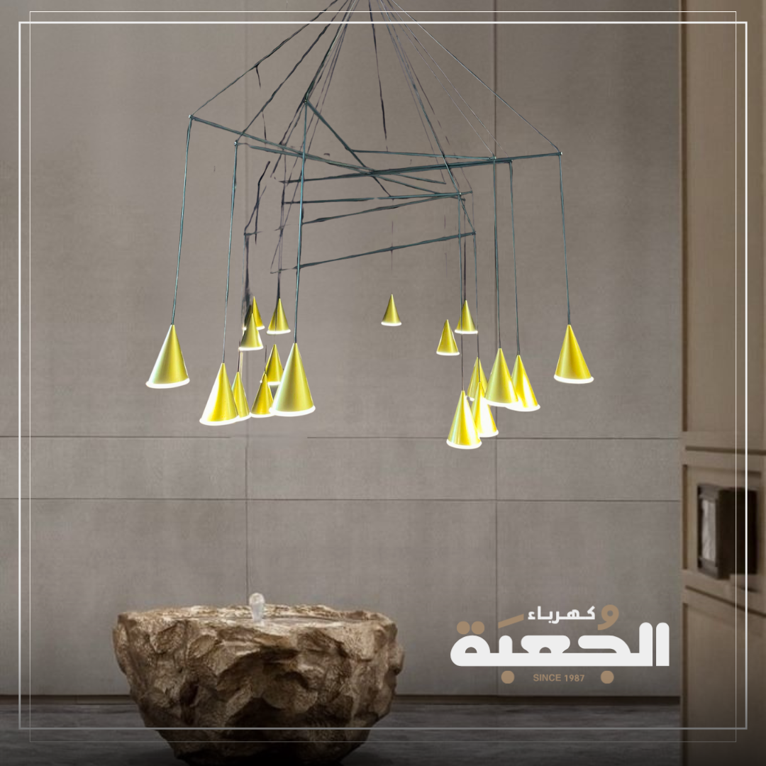 مواصفات الصنف: معلقة مميزة من الاحبال الممزوجة بالاشكال المخروطية المضيئة بشكل متناسق مع المكان