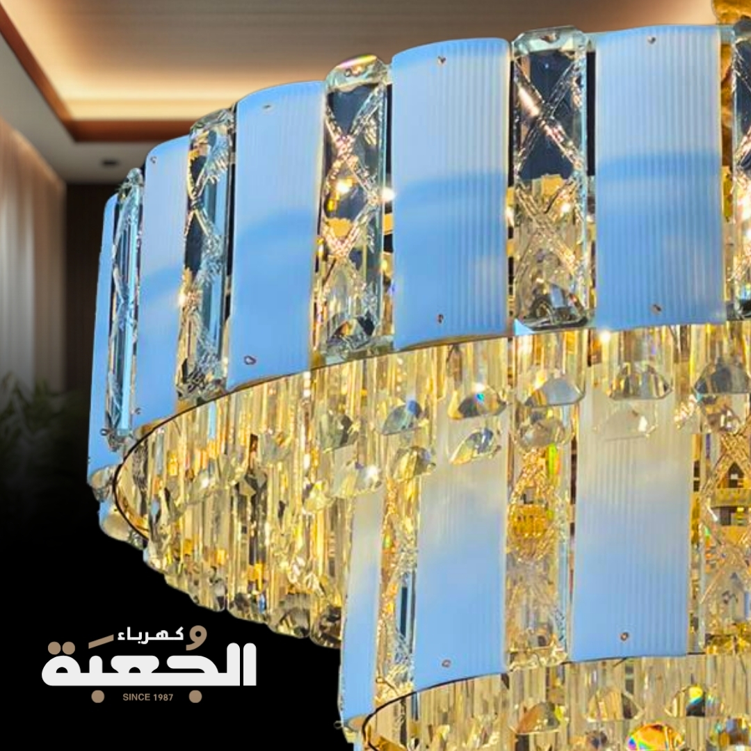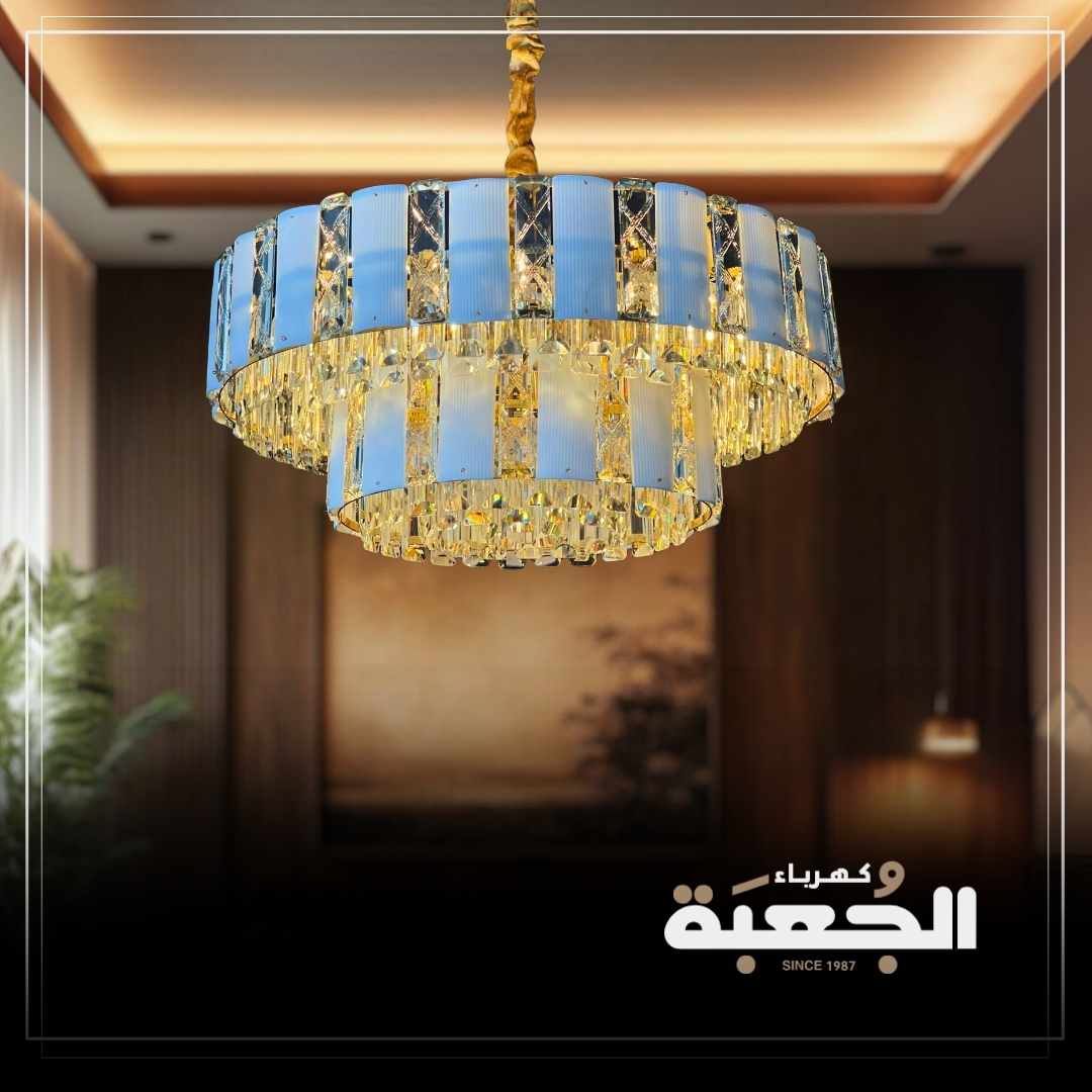 مواصفات الصنف : ثريا كريستالية باللون الفضي ممزوج بالمعدن الابيض تحتوي على حبات الكريستال الطولية تعطي طابع الفخامة