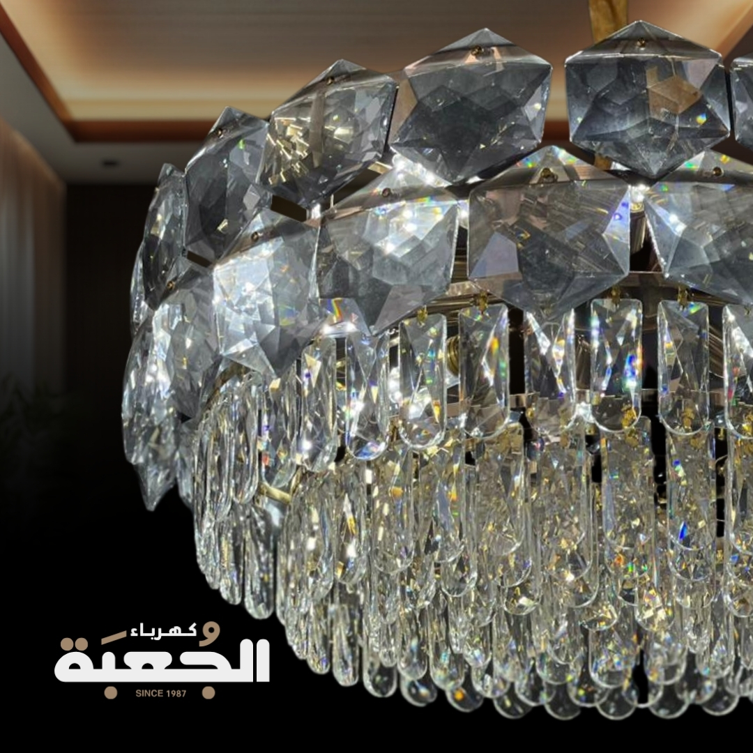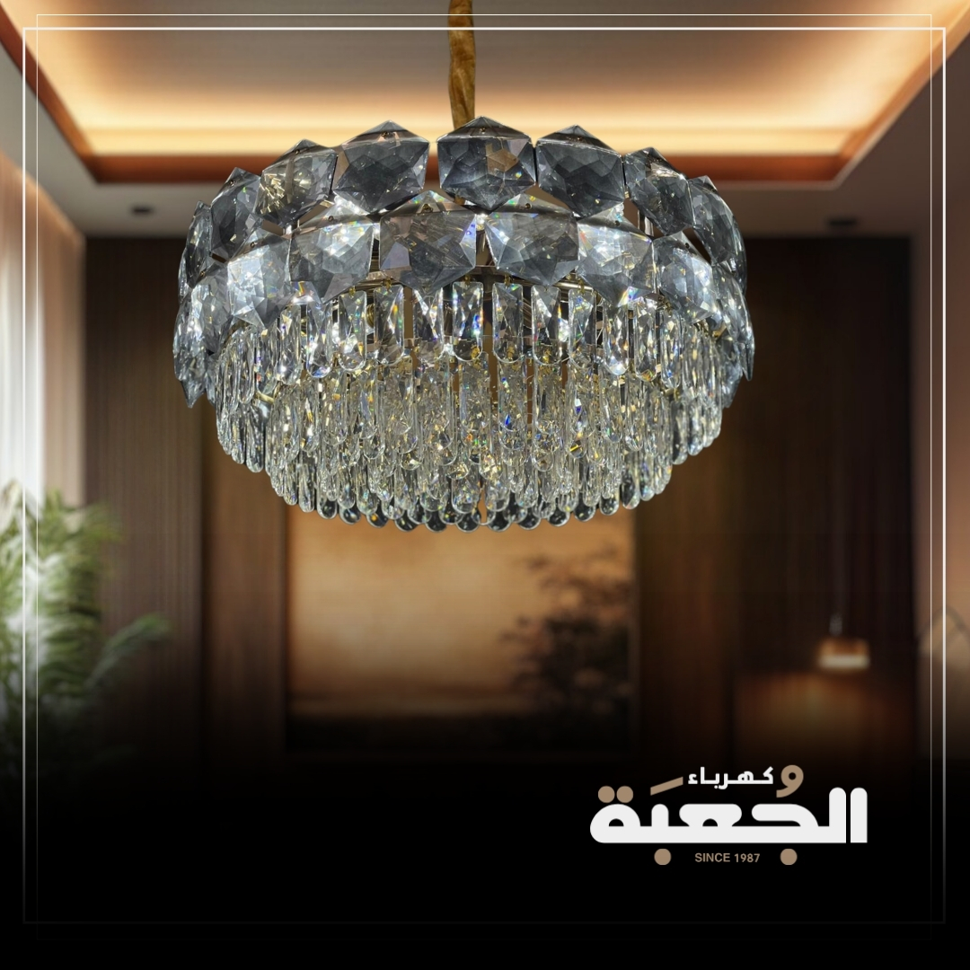 مواصفات الصنف : ثريا كريستالية جوهرية باللون الفضي ممزوجة بحبات الكريستال المرصعة تعطي طابع الفخامة والأناقة